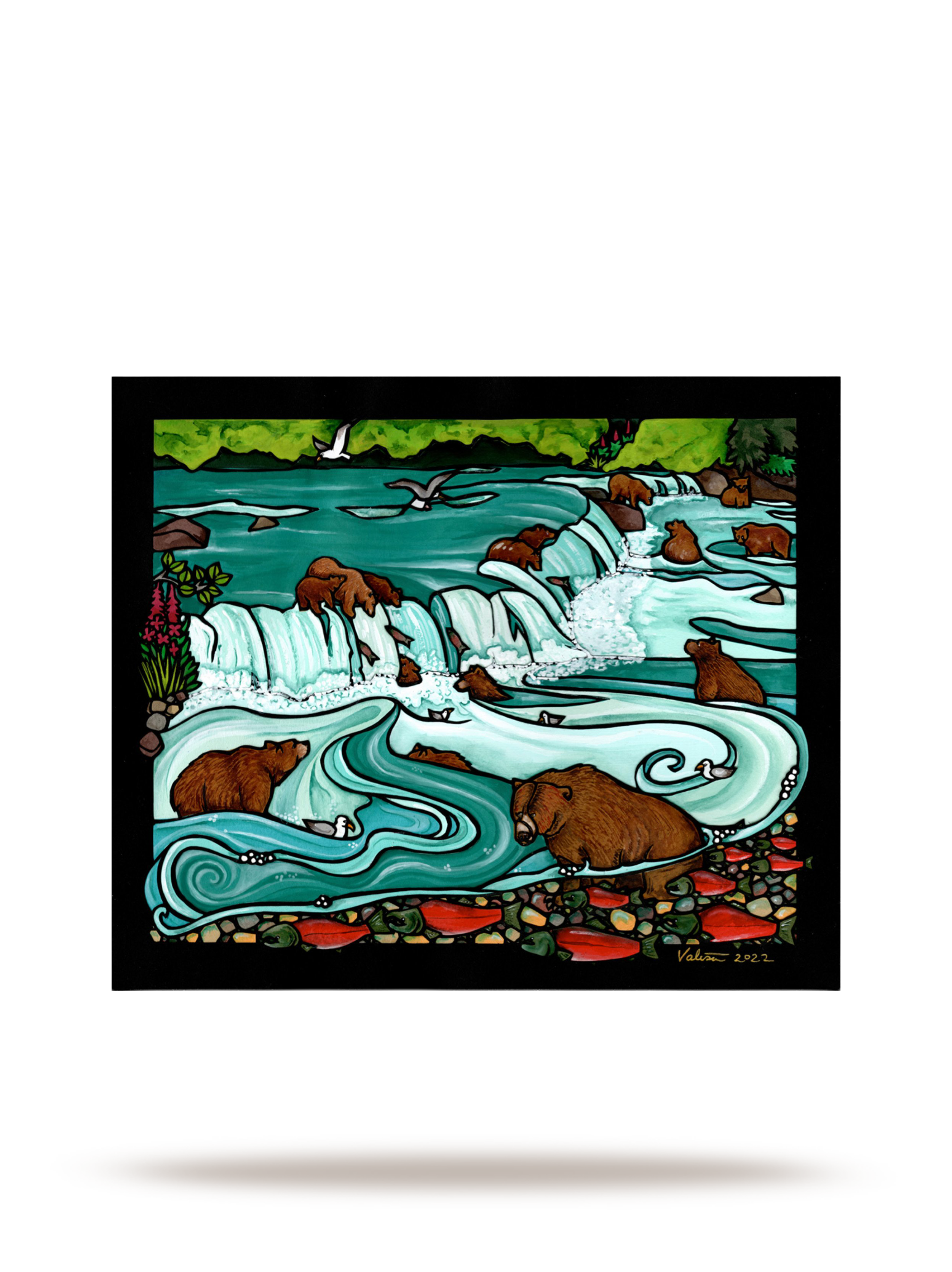 A vibrant scene from Katmai, ready to go wherever you do, this colorful 4" x 3.37" sticker features an original illustration by Alaskan artist Valisa Higman capturing some of the most recognizable bears of Brooks Falls during Fat Bear Week 2022. Printed on weather-resistant, durable material suitable for indoor or outdoor use, it’s built to last on water bottles, laptops, cars, and travel gear while celebrating the energy and spirit of Brooks Falls in bold, detailed style.