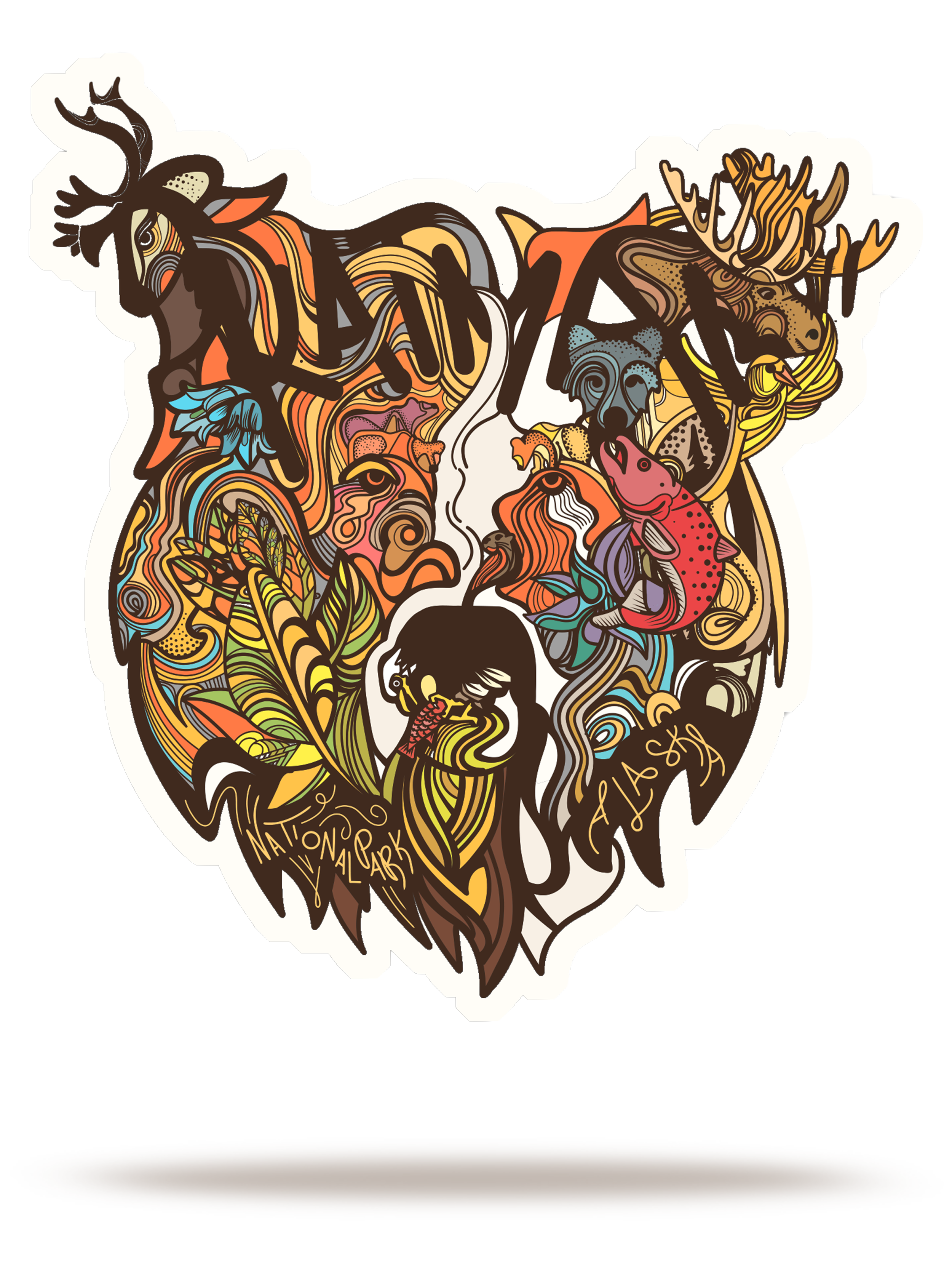 A celebration of Katmai’s wild diversity in one striking design, this 4" x 4" weatherproof sticker features original artwork by Matt Brass showcasing a bear silhouette alive with intricate, colorful depictions of the park’s iconic wildlife, from salmon and bald eagles to moose, caribou, and more. Printed on durable, weather-resistant vinyl, it’s weatherproof and suitable for indoor or outdoor use, making it a vibrant addition to your water bottle, laptop, car, or outdoor gear.