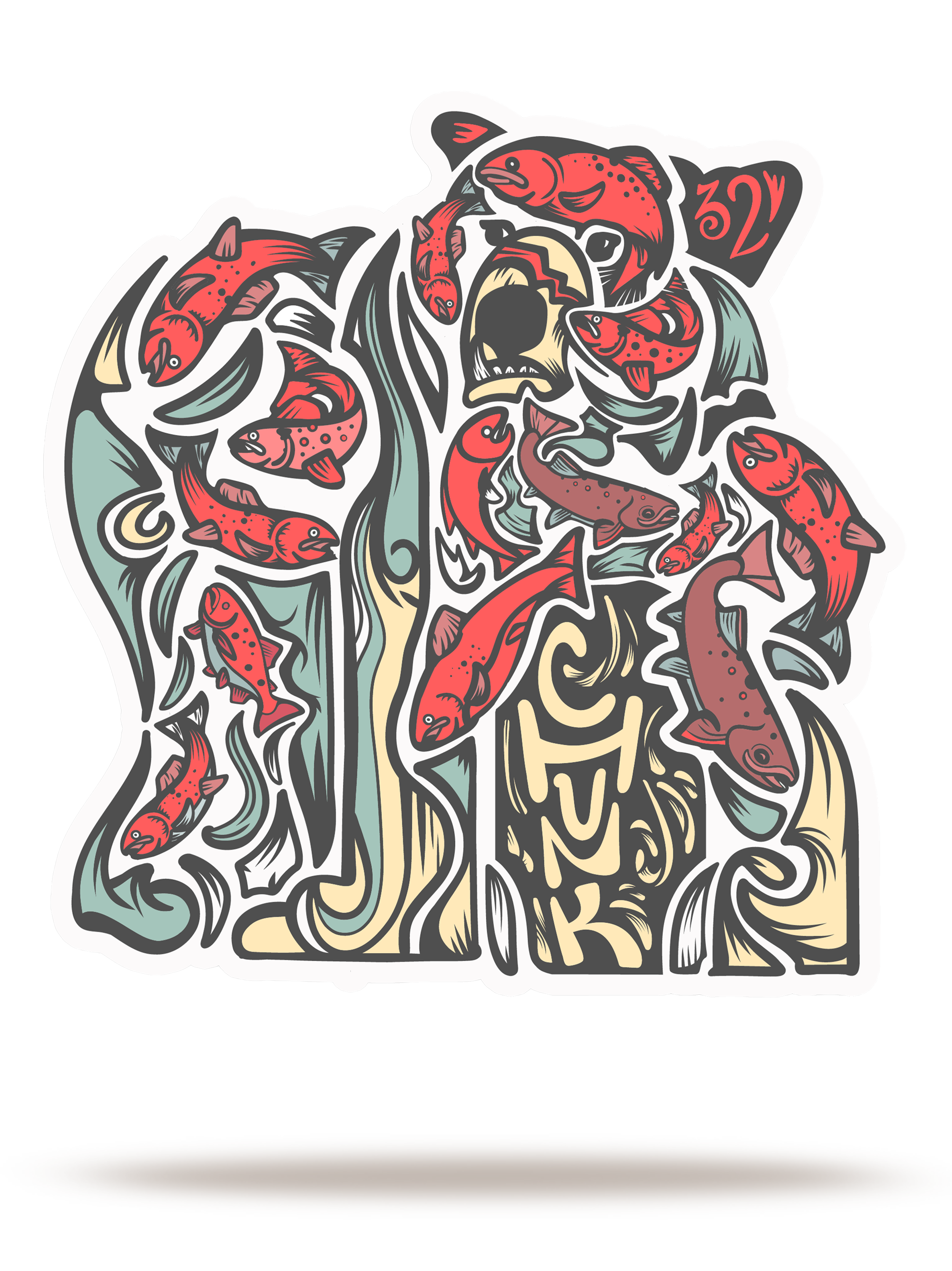 This weatherproof sticker features original artwork by Matt Brass celebrating 32 Chunk, the 2025 Fat Bear Week champion, surrounded by salmon and bold river shapes that capture the energy of Brooks River during the 2025 peak season. Approximately 4" in size (varies with die-cut shape), it’s printed on durable vinyl, weatherproof and durable, suitable for indoor or outdoor use, and ready for water bottles, laptops, cars, or any gear that goes where you go.
