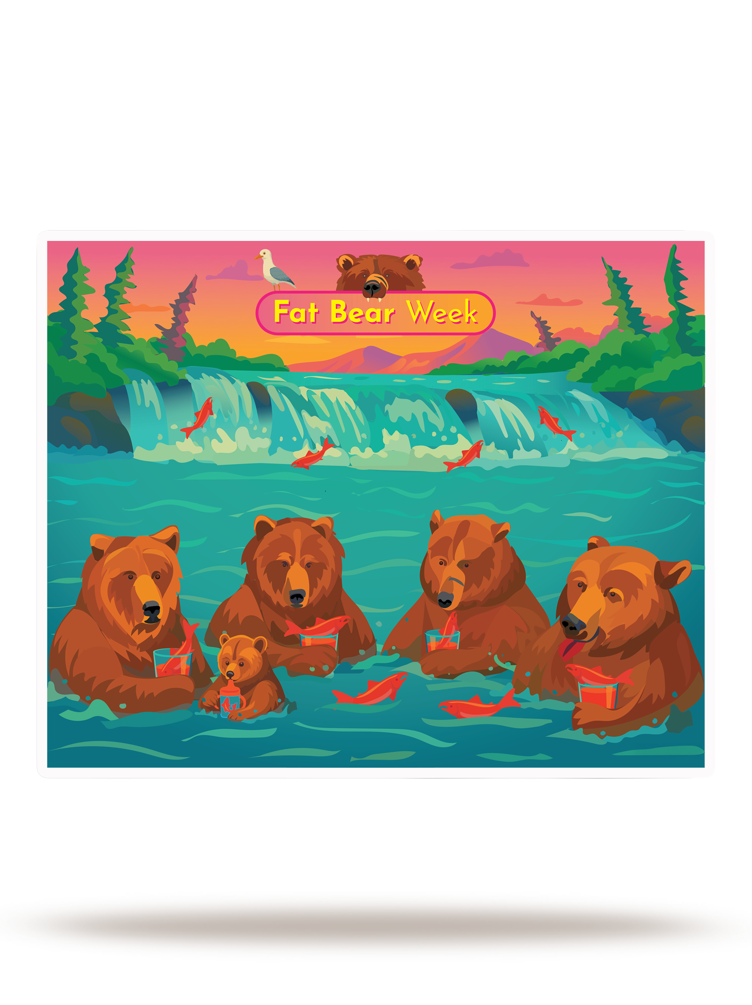 Celebrate the spirit of Fat Bear Week with this vibrant, weatherproof sticker featuring artwork by Sara Wolman. The illustration brings together a group of brown bears fishing below Brooks Falls, surrounded by jumping salmon and the warm colors of a Katmai summer evening. Printed on durable vinyl, it’s designed to hold up to the elements and adds a bright touch to water bottles, laptops, coolers, and outdoor gear.