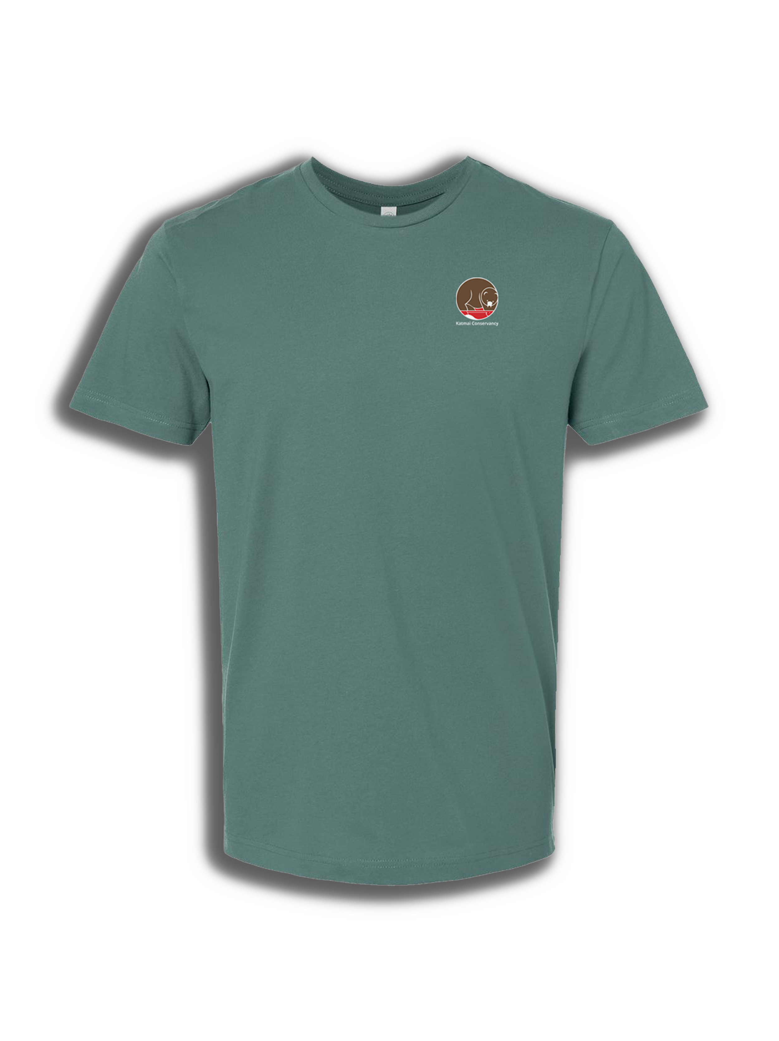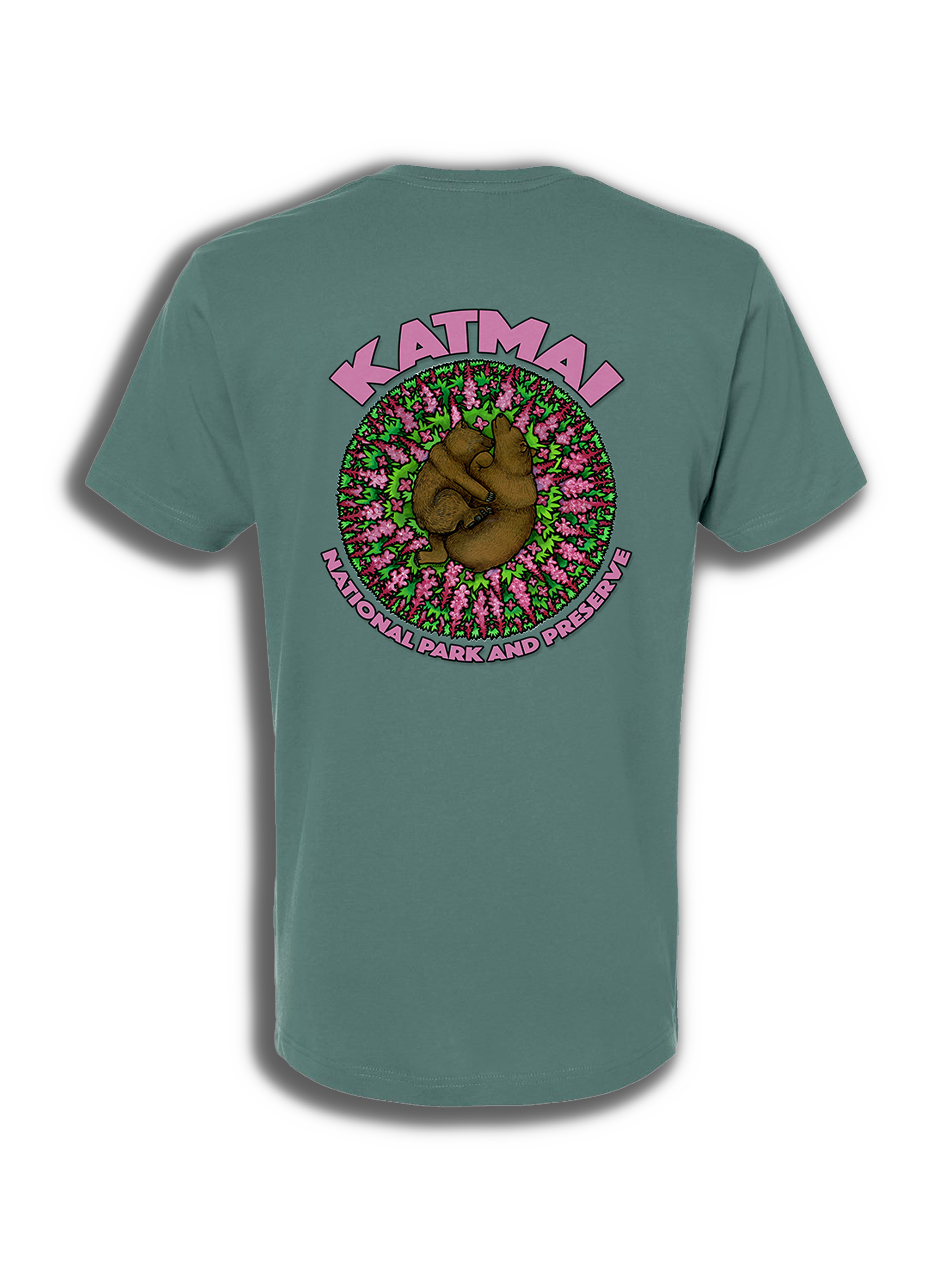 A quiet moment, framed in fireweed, this Basil-colored T-shirt features a serene back illustration by Alaskan artist Valisa Higman depicting a mother brown bear and her cub surrounded by vivid blooms of Katmai’s iconic fireweed. The detailed DTG print brings rich color and fine detail to life, while a small Katmai Conservancy logo on the front left chest adds a subtle connection to the place that inspires it. Crafted from 100% organic combed ringspun cotton in a comfortable unisex fit, this soft, breathable tee is a timeless tribute to the tenderness and wild beauty of Katmai.