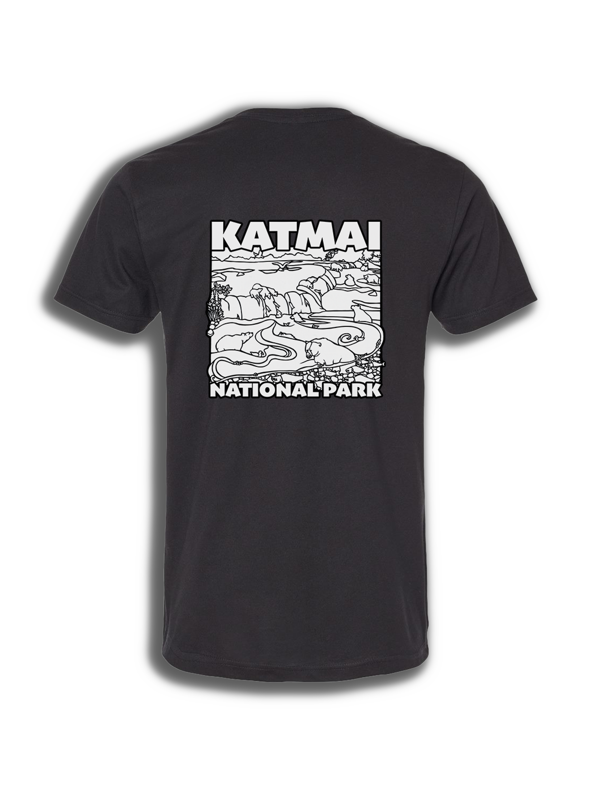 A classic scene, in bold contrast, this Katmai Brooks Falls Black T-shirt features Alaskan artist Valisa Higman’s striking back illustration of Brooks Falls, where bears gather each summer to fish for salmon, rendered in clean white detail against deep black fabric. The high-contrast design captures the wild energy and movement of Katmai’s most famous fishing grounds, while a small Katmai Conservancy logo on the chest adds a subtle finishing touch. Crafted from a soft, sustainably made blend of 60% organic cotton and 40% recycled polyester, this unisex-fit tee is DTG-printed for crisp detail and lasting durability, creating a timeless tribute to one of Alaska’s most iconic scenes.